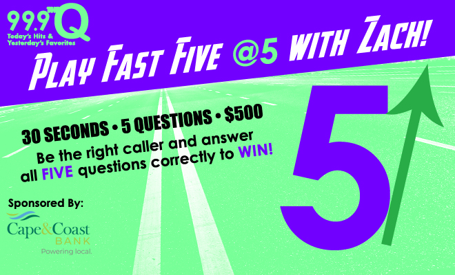 The Fast Five at Five is your chance to put your trivia skills to the test every weekday afternoon at 5 on 99.9 The Q with Zack. When the clock hits five, be the right caller and step into the hot seat for a fast-paced challenge that keeps listeners on the edge of their seats.